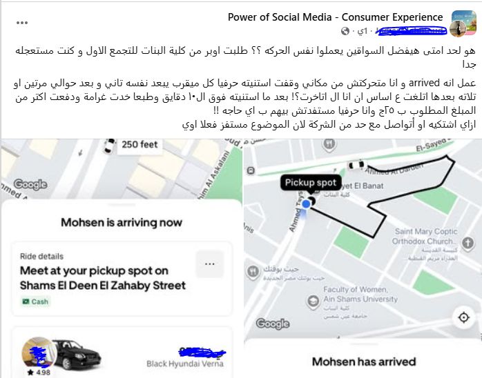 في واقعة نشرت على صفحة Power of Social Media - Consumer Experience، تروي إحدى المستخدمات تجربتها المريرة التي بدأت بطلب رحلة من منطقة كلية البنات بمصر الجديدة متجهة إلى التجمع الأول، ورغم استعجالها الشديد، فوجئت بالسائق يفعل خاصية الوصول Arrived رغم تواجده في مكان بعيد.