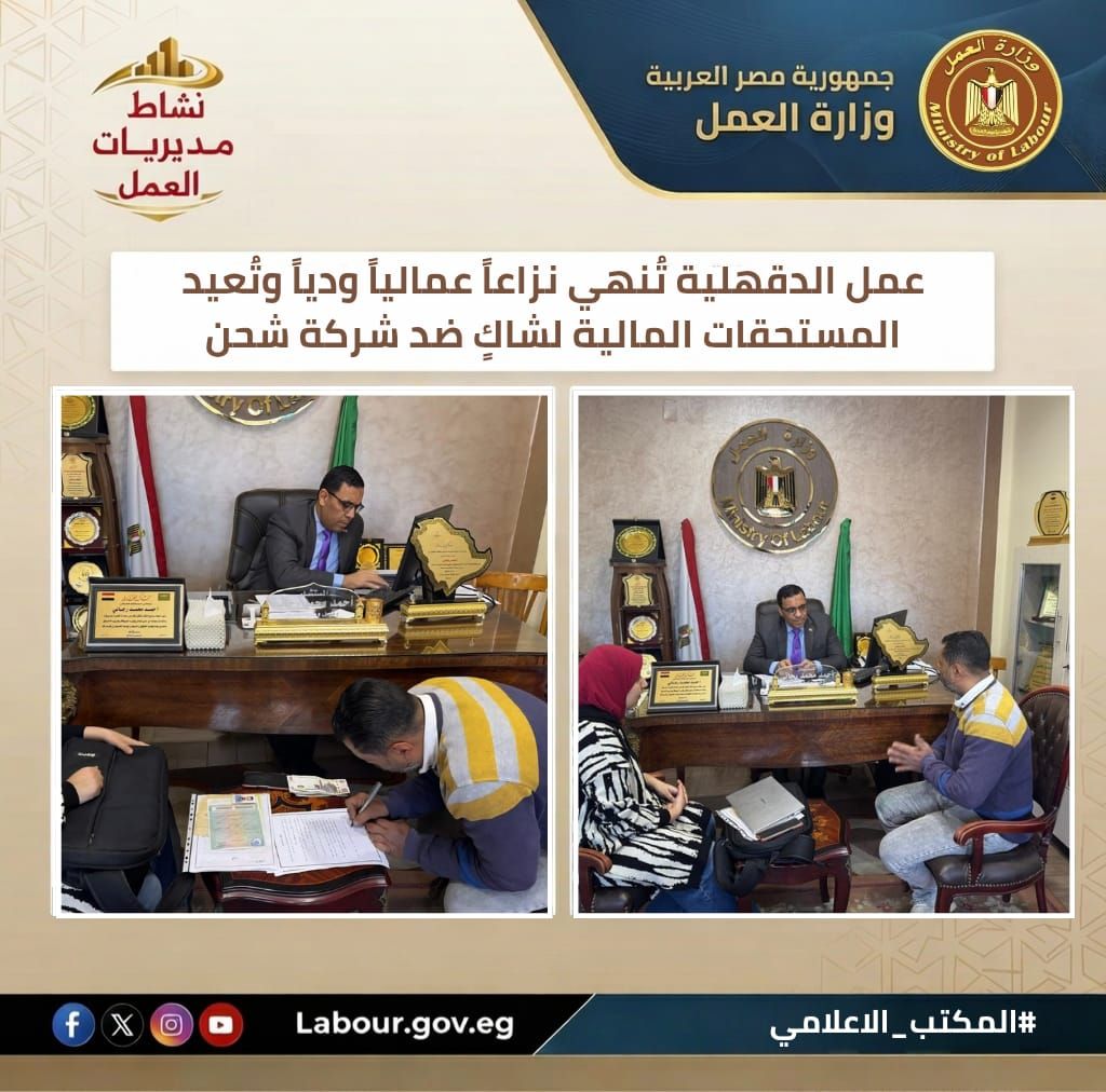 نجحت مديرية عمل الدقهلية، في تسوية نزاع عمالي وديًا بين أحد المواطنين وشركة شحن.