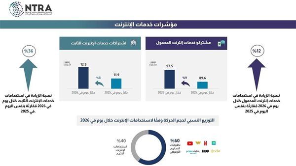 أصدر الجهاز القومي لتنظيم الاتصالات مؤشرات استخدام تطبيقات الإنترنت خلال 24 ساعة في 2026، والتي شهدت زيادة ملحوظة في استخدام تطبيقات المحتوى الترفيهي بنسبة وصلت إلى 60%، وبمقارنة المؤشرات بنفس اليوم في 2025، تبين حدوث زيادة في استخدام خدمات الإنترنت المحمول بنسبة 12% في ظل ارتفاع عدد مستخدمي خدمات الإنترنت المحمول 7.9 مليون مستخدم جديد، كما تبين حدوث زيادة في استخدام خدمات الإنترنت الثابت بنسبة 36% في ظل ارتفاع عدد مستخدمي خدمات الإنترنت الثابت مليون مستخدم جديد.