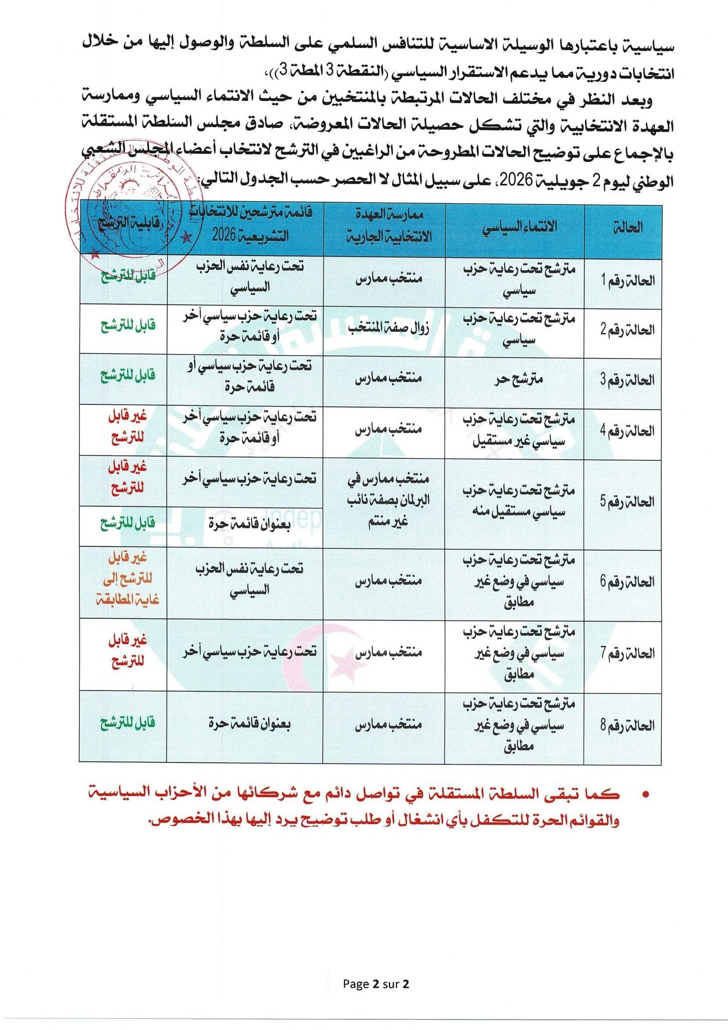 وفي سياق متصل، عرضت السلطة الوطنية المستقلة للانتخابات جملة من الحالات النموذجية لتوضيح الحالات المطروحة من الراغبين في الترشح لانتخاب أعضاء المجلس الشعبي الوطني ليوم 2 جويلية 2026، على سبيل المثال لا الحصر حسب الجدول التالي: