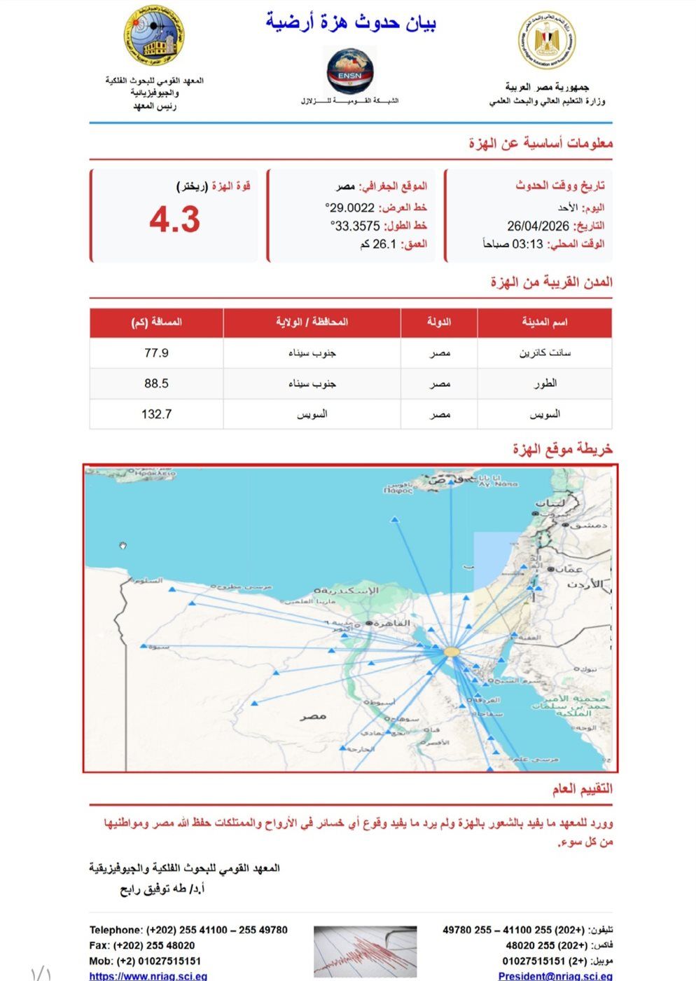 أطلق المعهد القومي للبحوث الفلكية والجيوفيزيقية تحذيرًا عاجلًا للمواطنين، بعد الزلزال الذي شعر به سكان خليج السويس والبحر الأحمر، داعيًا إلى متابعة البيانات الرسمية فقط، وعدم الانسياق وراء الشائعات.
