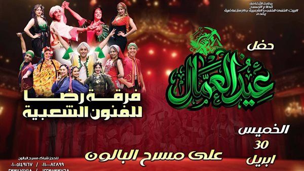 تحت رعاية الدكتورة جيهان زكي وزيرة الثقافة، وبالتعاون مع قطاع المسرح برئاسة الفنان أيمن الشيوي، ينظم البيت الفني للفنون الشعبية والاستعراضية برئاسة الفنان تامر عبدالمنعم، احتفالية فنية كبرى بمناسبة عيد العمال، وذلك يوم الخميس الموافق 30 أبريل الجاري على مسرح البالون.